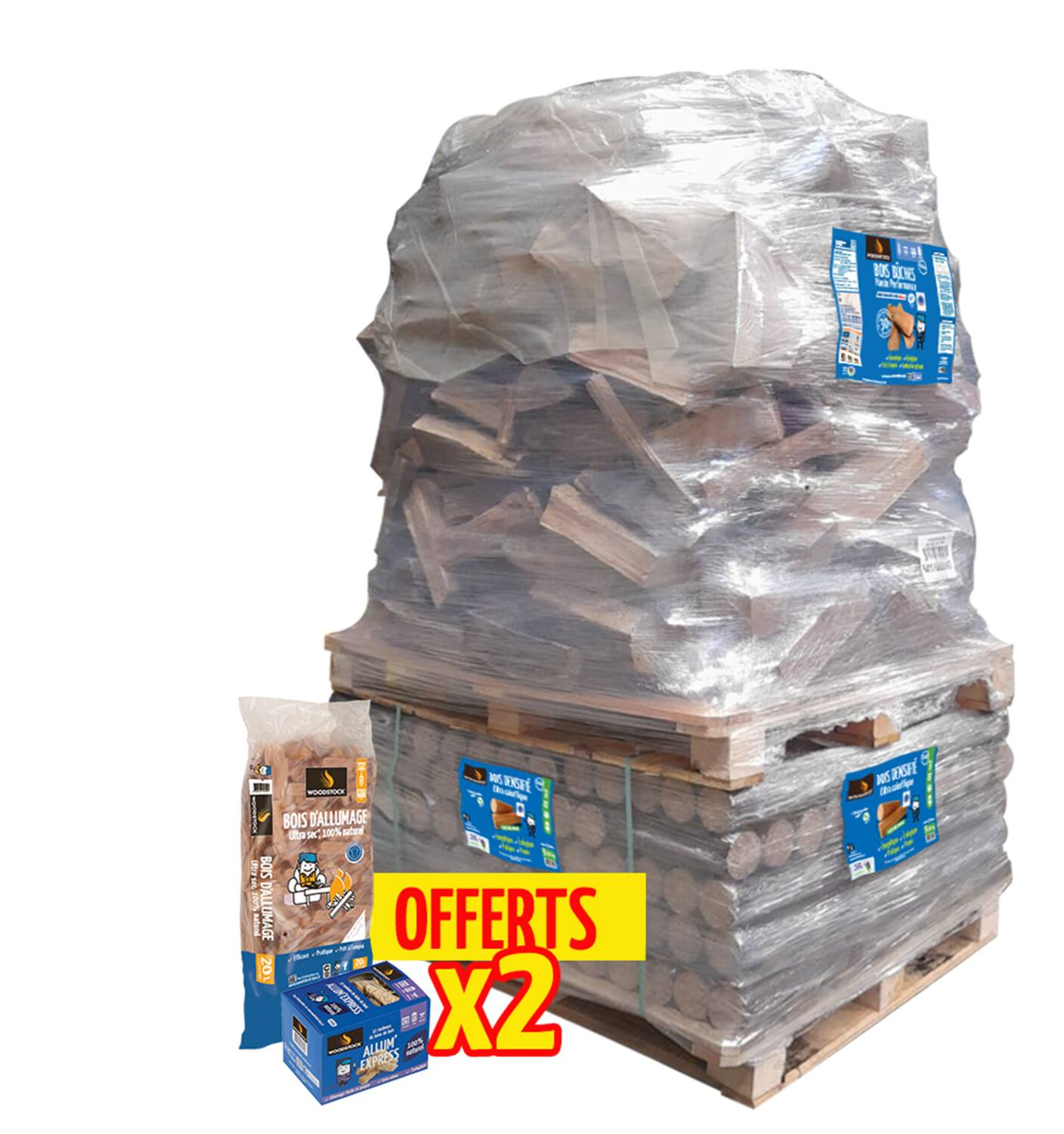 3 bales of 1300 dm3 of high-performance logs (30 cm), dried to less than 20% moisture content, partially debarked, free of moss and lichen. Made in France from the finest hardwoods. Packaged in 1300 dm3 bales, the logs are ready to use! +120 packs of 5 compacted logs: Woodstock Bois compacted logs are made from sawdust and wood chips compressed to a very high density, 100% natural, and highly energy efficient! + 6 FREE 20-liter bags of kindling and 6 boxes of Woodstock firelighters